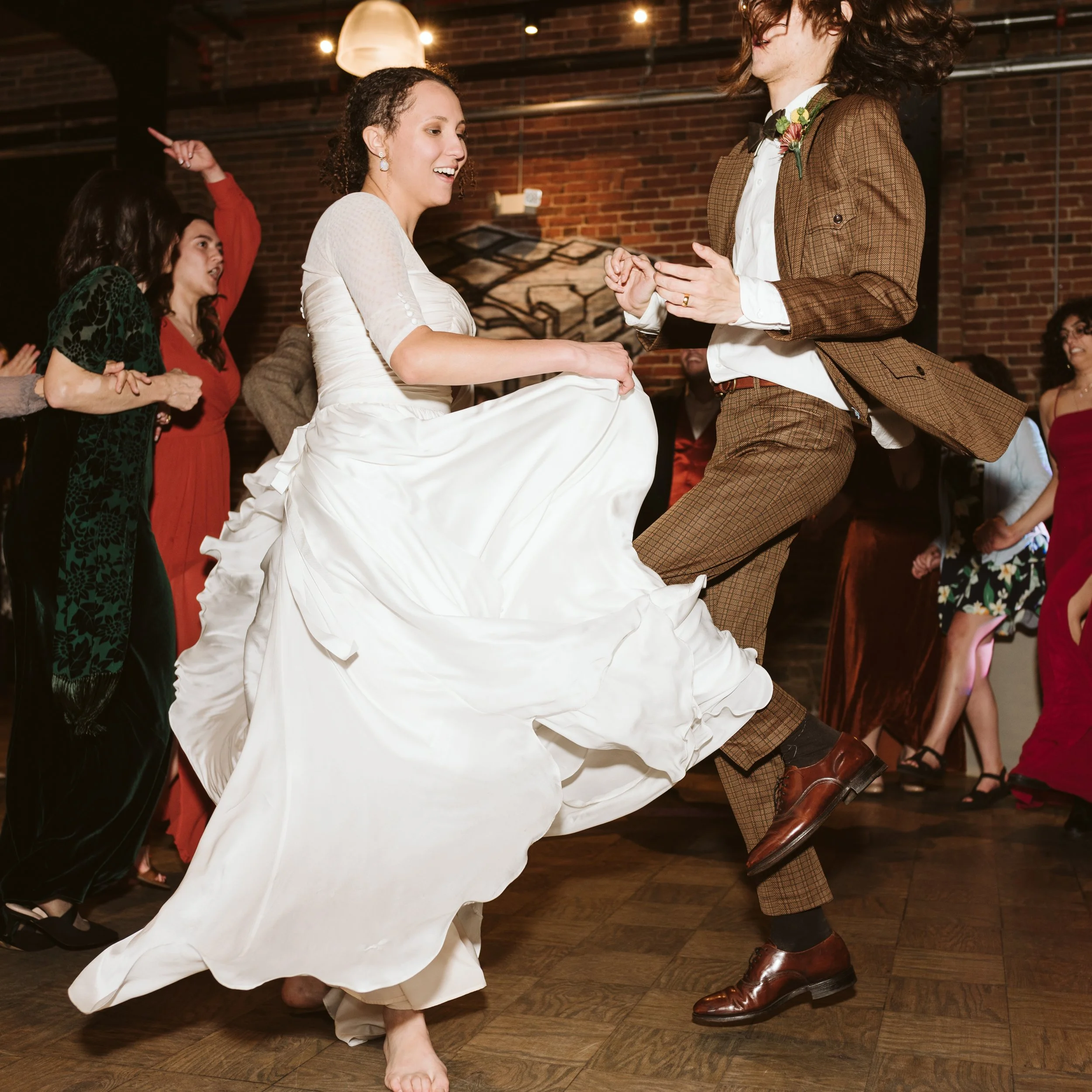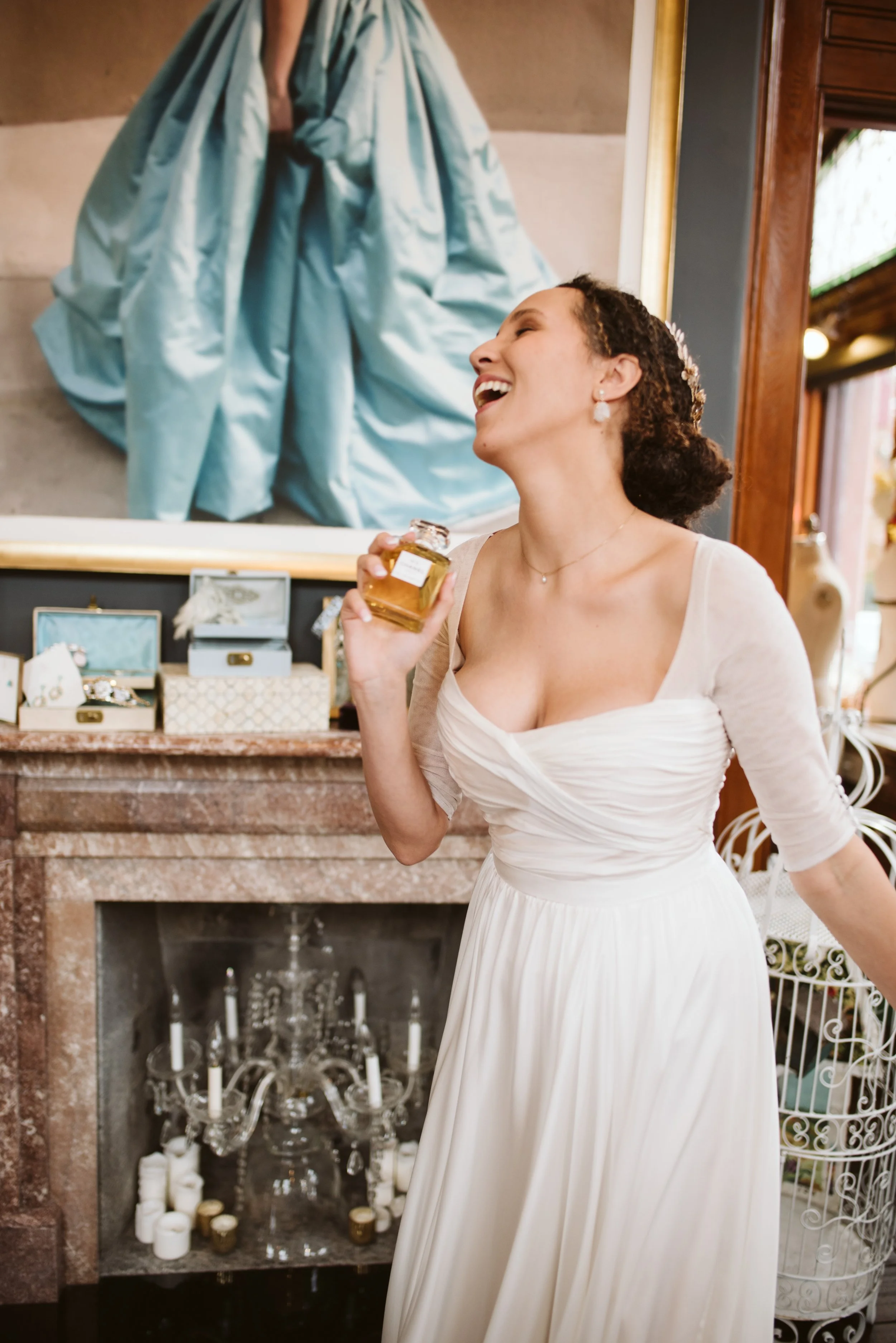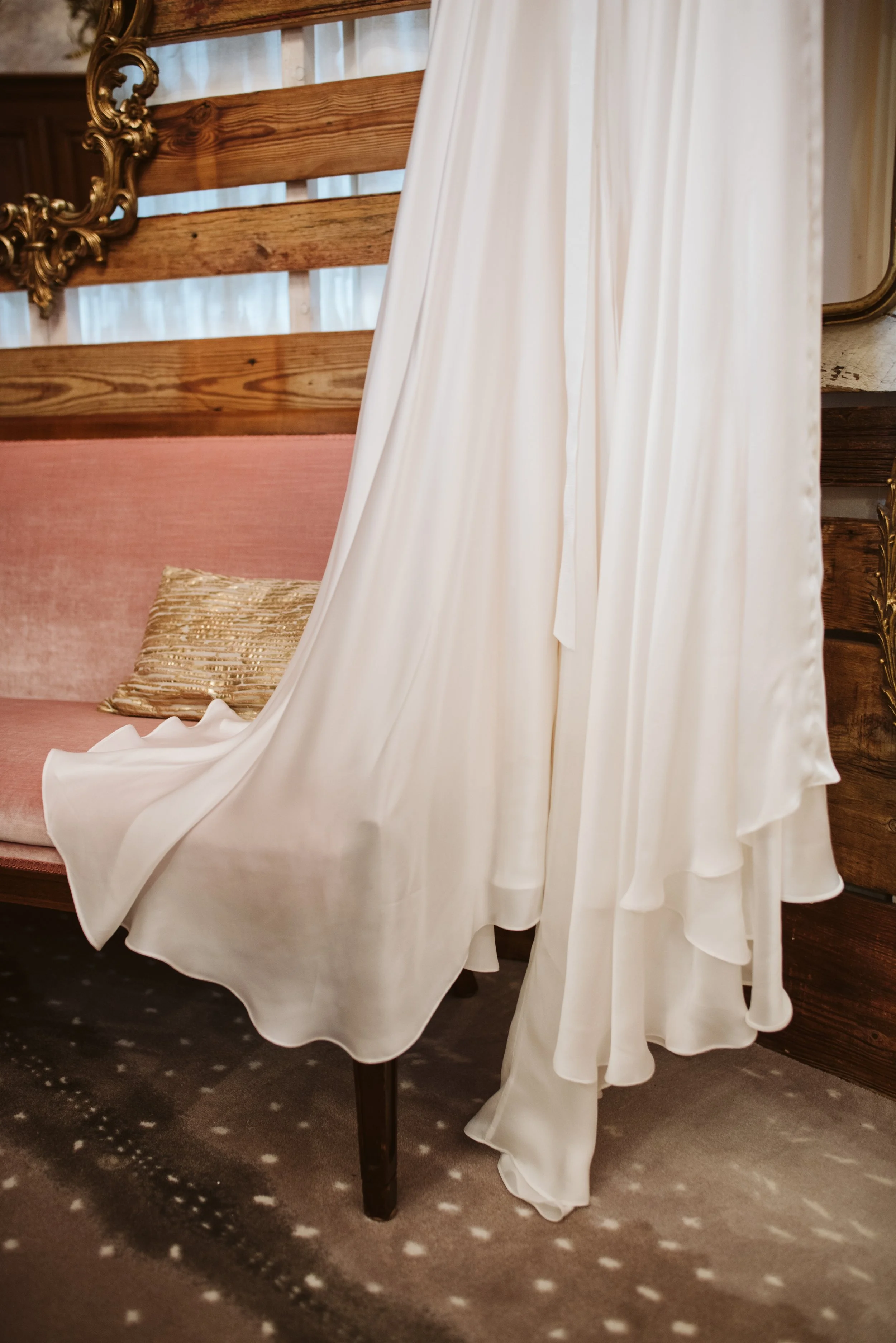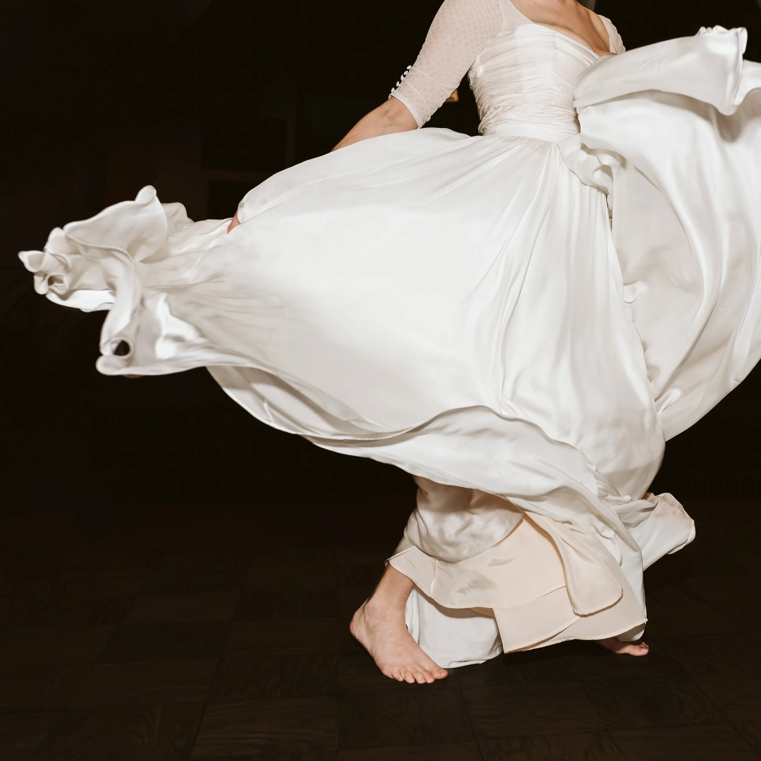 Crafted from the finest ivory silk, this custom dress for Maxi was made for dancing. The wrap-style bodice elegantly accentuates Maxi's curves, while the sweetheart neckline enhances her natural radiance. Delicate three-quarter sleeves finished with fabric buttons add an enchanting touch of sophistication, exuding refined grace and romance. The ethereal circle skirt, adorned with delicate pleats, billows and floats as Maxi glides across the dance floor, lending an enchanting movement to her every step. Evoking a sense of dreamy romance, this gown ensured Maxi's freedom of movement as she celebrated her special day.